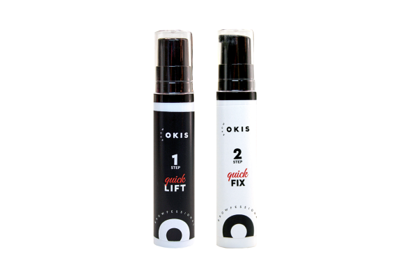 2 žingsnis OKIS BROW QUICK FIX – greitai fiksuoja formą, atkuria disulfidines jungtis, uždaro kutikules ir atkuria natūralų plaukelių pH.